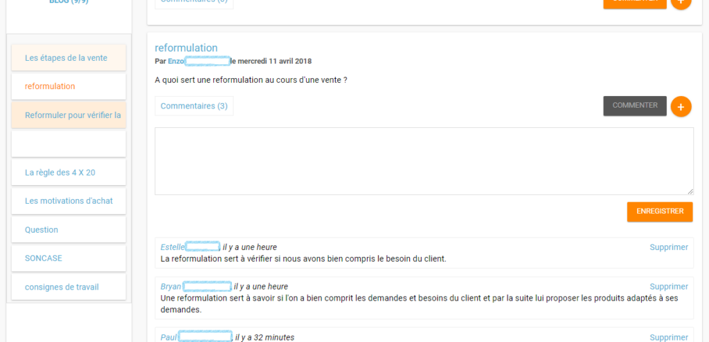 De retour en classe, les élèves et l’enseignant échangent de façon collective afin de déterminer la (ou les) réponse(s) la (les) plus appropriée(s), qui sera(seront) conservée(s) sur le blog. Le débat porte sur le fond et sur la forme (ponctuation, orthographe …). Les notions sont réexpliquées si besoin.