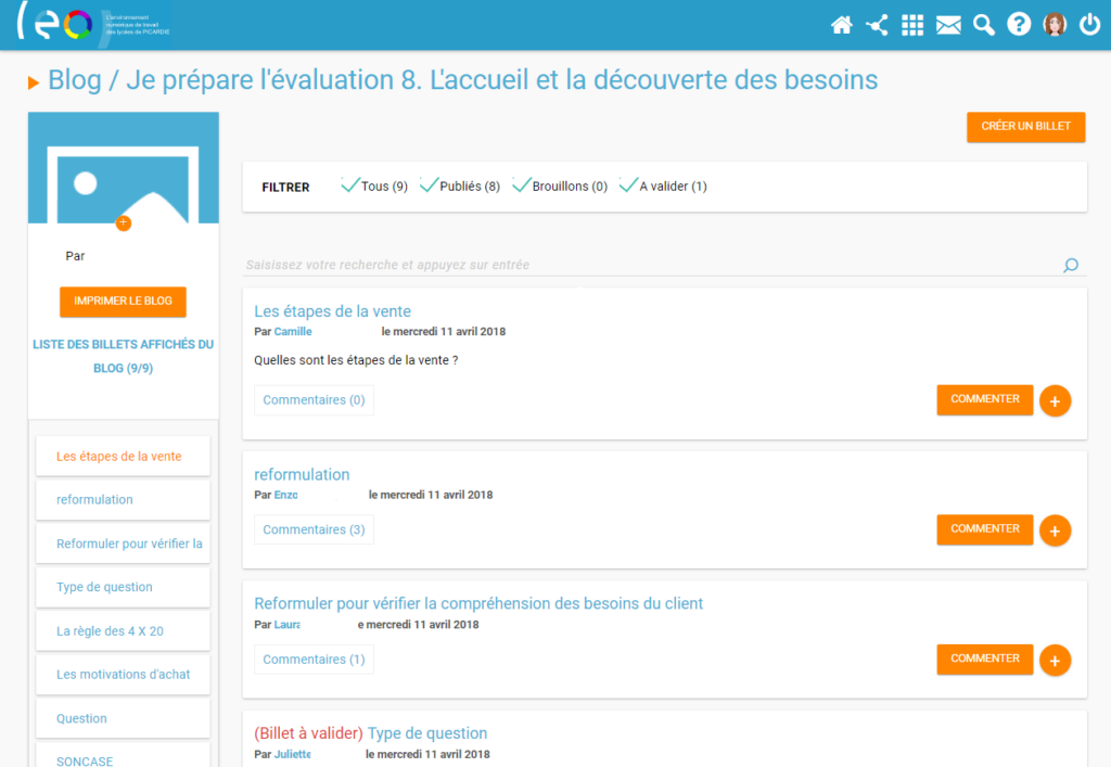 A la fin de chaque séquence, une semaine avant l’évaluation sommative, l’enseignant ouvre un blog sur l’ENT et partage les droits de contribution et de commentaires aux élèves. Les billets publiés sont modérés par l’enseignant.