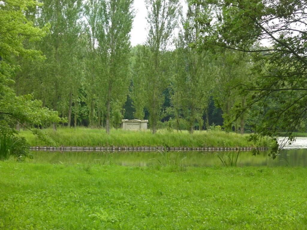 «La tombe de Rousseau est restée telle qu’elle était, avec sa forme antique et simple, et les peupliers, effeuillés, accompagnent encore d’une manière pittoresque le monument, qui se reflète dans les eaux dormantes de l’étang. Seulement la barque qui y conduisait les visiteurs est aujourd’hui submergée… Les cygnes, je ne sais pourquoi, au lieu de nager gracieusement autour de l’île préfèrent se baigner dans un ruisseau d’eau bourbeuse, qui coule, dans un rebord, entre des saules aux branches rougeâtres, et qui aboutit à un lavoir, situé le long de la route. »