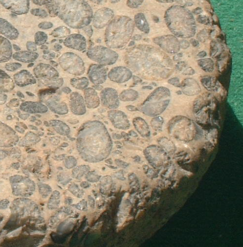 Le car étant stationné dans un des endroits choisis à partir de la carte, il faut rechercher le long des chemins bordant les champs, des plaques à aspect plus ou moins spongieux qui correspondent au calcaire de Mortemer. Dans ce niveau, Il ne s’agit pas véritablement d’un calcaire mais d’une roche essentiellement siliceuse et rappelant la meulière. Les empreintes de fossiles sont très variables. Le plus souvent, l’emplacement des folioles se trouvent conservé, donnant une structure lamellaire à la roche. Parfois, la roche a moulé le départ des pétioles (exemple de la photo). Dans des cas beaucoup plus rares, c’est l’empreinte même des vaisseaux irrigant la feuille qui est conservée.