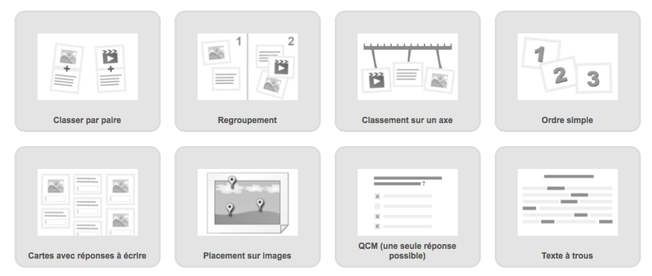 | Son but est de favoriser la création de modules pédagogiques intégrables dans un parcours de formation auprès des enseignants.-> On crée un compte pour sauvegarder les exercices dans un espace personnel. -> On peut créer des classes et des comptes pour les élèves.-> Le travail préalable à la création d’une application est important, il faut étudier le sujet pour trouver des questions pertinentes et vérifier les bonnes réponses. -> Les modèles d’exercices proposés peuvent être modifiés. -> Quand on crée une application il faut mettre un titre, une consigne, les questions et réponses attendues, le petit mot de FÉLICITATIONS et quelques choix de mise en forme (image de fond, etc …), bref les éléments indispensables pour ce genre d’outil. -> Pour un TP mosaïque, les élèves peuvent créer une application, faire une synthèse et le présenter lors de la phase de mise en commun aux autres groupes. -> Réviser une notion en petit groupe et préparer une appli pour réinvestir et consolider des connaissances. | ->Une grande variété d’applications très variées (exercices, QCM, classements, memory, mots croisés, associations. ->Convivial ->La création des activités est facile (surtout en collège) ->En lycée : intéressant pour l’aide personnalisée, séance de révisions ->On peut enregistrer les apps que l’on crée. ->Les élèves y ont accès de chez eux ->Il est possible de créer une classe sur le site pour donner accès aux élèves, mais également d’importer les applications dans L’ENT. ->L’application génère également un QR code, ce qui permet d’envisager un usage comme aide sur des tâches complexe papier. | Les ajouts de médias se font par l’intermédiaire de sites web distants (youtube, wikimedia…), ce qui pose le problème du stockage à long terme. Très bien adapté au collège, moins au lycée. Le suivit des scores semble en revanche ne pas être possible, ce qui permet de faire de l’application une étape dans un parcours, mais en aucun cas une étape avec pré-requis. |