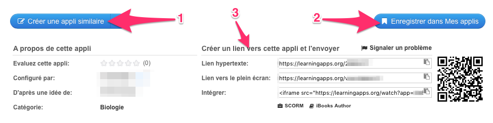 Quand vous trouvez une application intéressante il est possible de la copier pour la modifier selon vos envies ( en cliquant sur le bouton n°1 depuis la photo) ou de l’enregistrer sur votre compte ( en cliquant sur le bouton n°2 depuis la photo). Il est encore possible d’ajouter de diverses manières cette application (lien, qr-code ou directement sur une page internet : voir le point n°3 sur la photo).